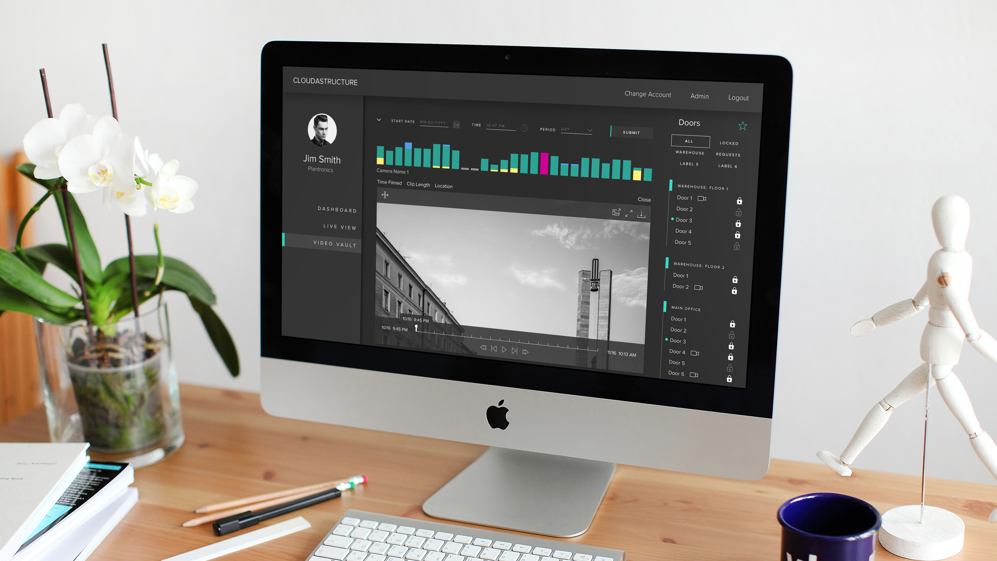 The sophisticated Cloudastructure product provides a complete viewing and security platform which seamlessly transitions between real-time video viewing, door surveillance and control, and recorded footage supervision and playback.